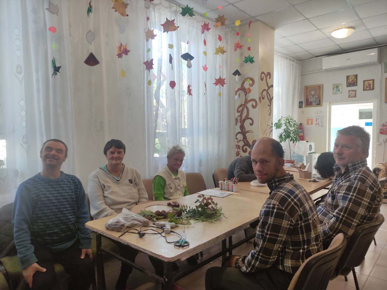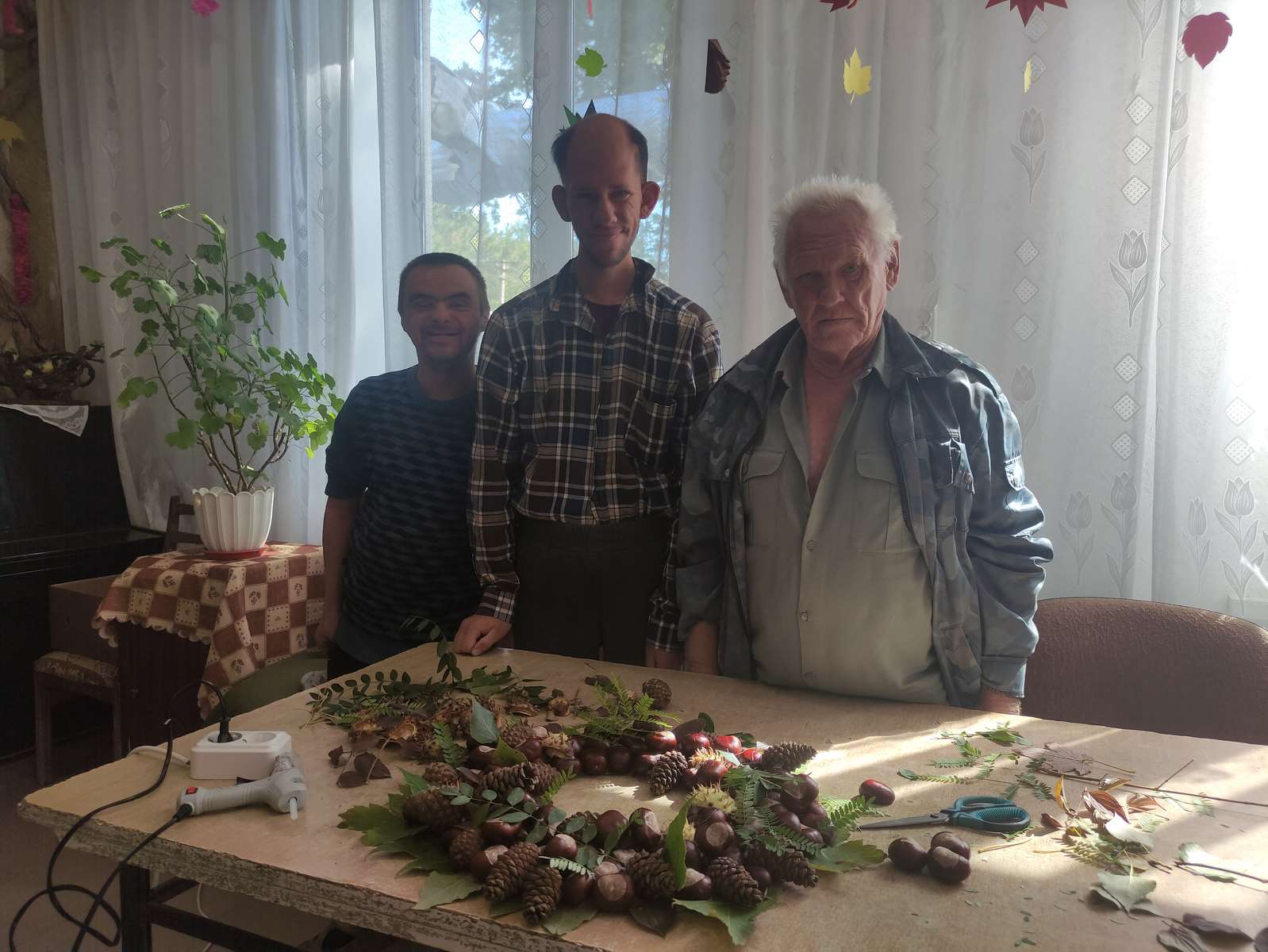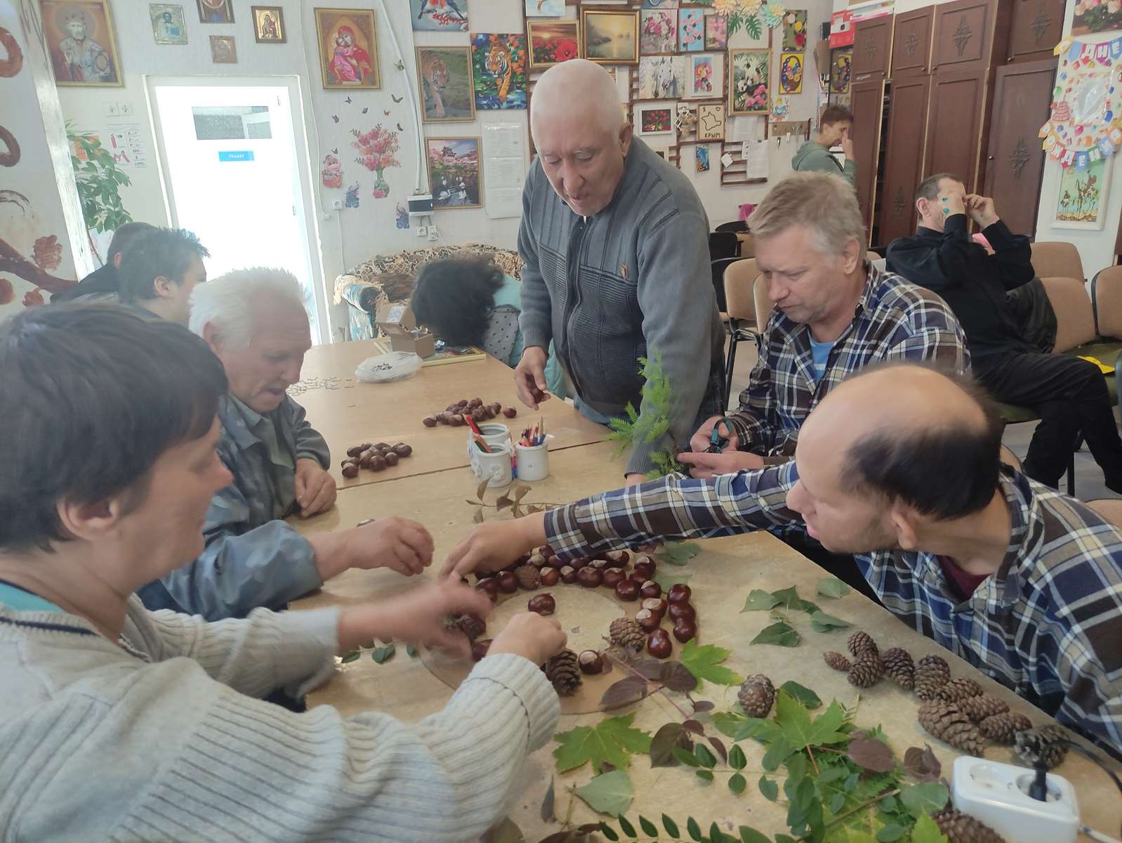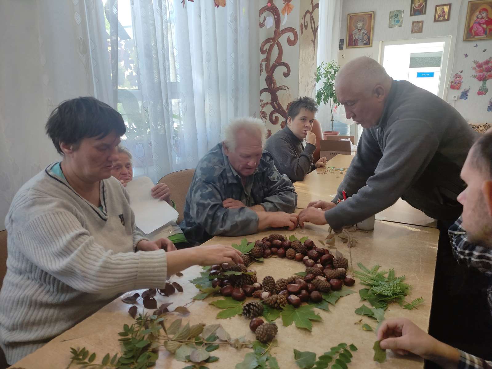 Подопечные с восторгом собирали и внимательно изучали шишки и каштаны, превращая их в оригинальные украшения, которые наполнили помещение энергией творчества и дружбы. С любовью и аккуратностью каждый элемент был вплетён в уникальный венок, отражающий фантазию и настроение автора.